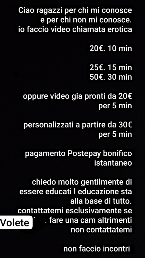 Faccio video chiamata erotica oppure chat foto video vocali 25 rose accetto postpai bonifico istantaneo non incontro no anteprime